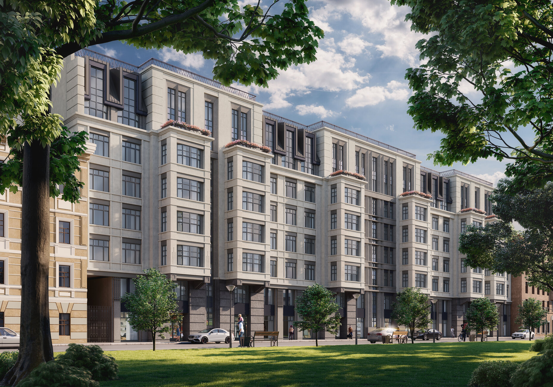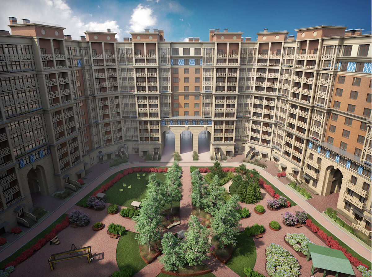 Два закрытых от посторонних и машин двора размещены на кровле стилобата. На территории разобьют игровые и спортивные площадки, места для отдыха с беседками и скамейками